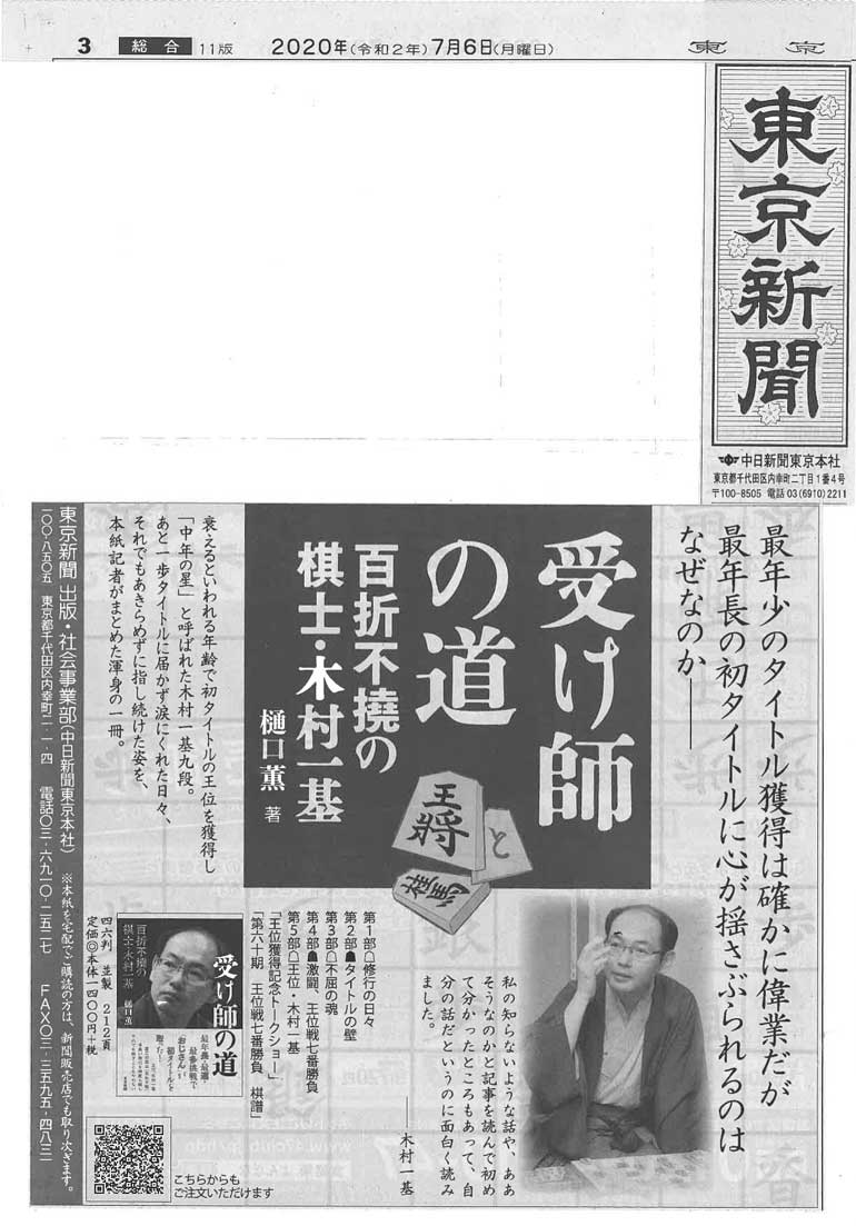 東京新聞に「受け師の道 百折不撓の棋士・木村一基」の